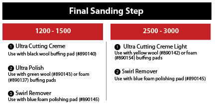 Select the appropriate compound and buffing pad: For heavy damage, you'll want to do a three-step process. We recommend starting with Presta Ultra Cutting Creme and a black wool heavy-cut buffing pad. This combination will remove heavy to medium scratches, oxidation, waterspots and acid rain damage. It will even remove up to 1200-grit wet sand scratches.
